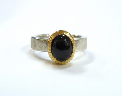 Sterling silver, 18ct gold & 10 x 8mm cabochon Pyrope Garnet.