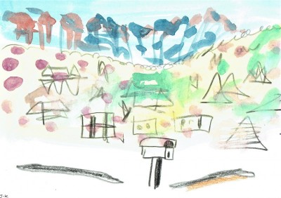Pencil and watercolour on paper.