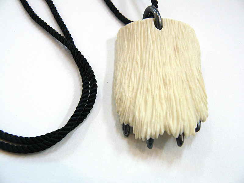 Bone, sterling silver & cord.