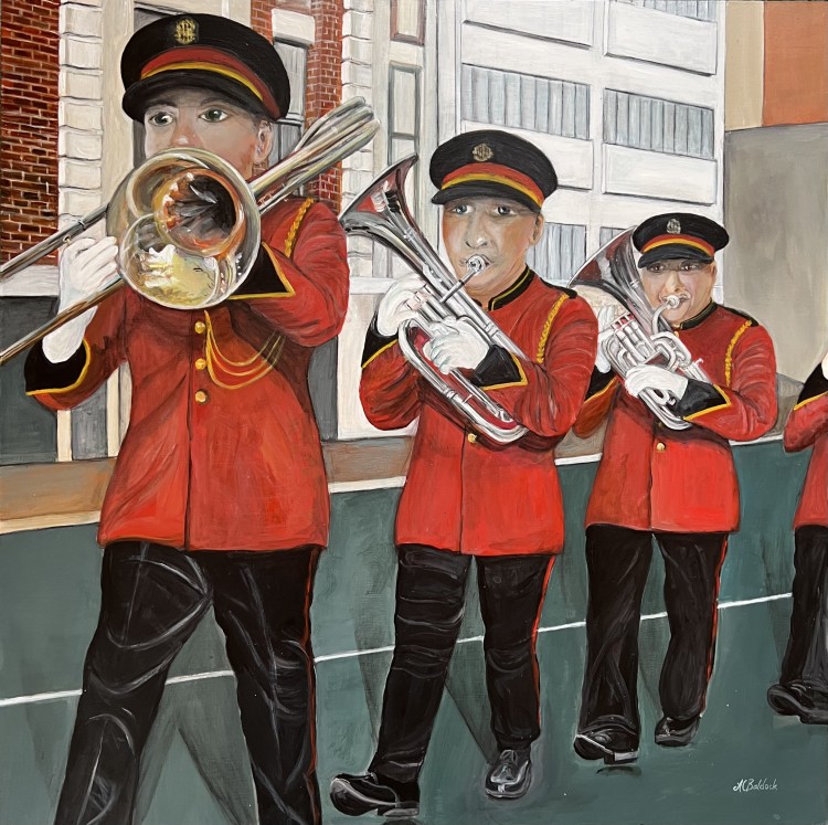 Mates - The characters are ‘no one’ in particular, but they are familiar - you know you’ve seen them somewhere - passing you in the street, in a cafe or maybe on the television. Interesting faces with imperfect features draw me in, subconsciously channelling me to feature in future works. Repeated shapes and patterns predominate, giving order to a busy mind.