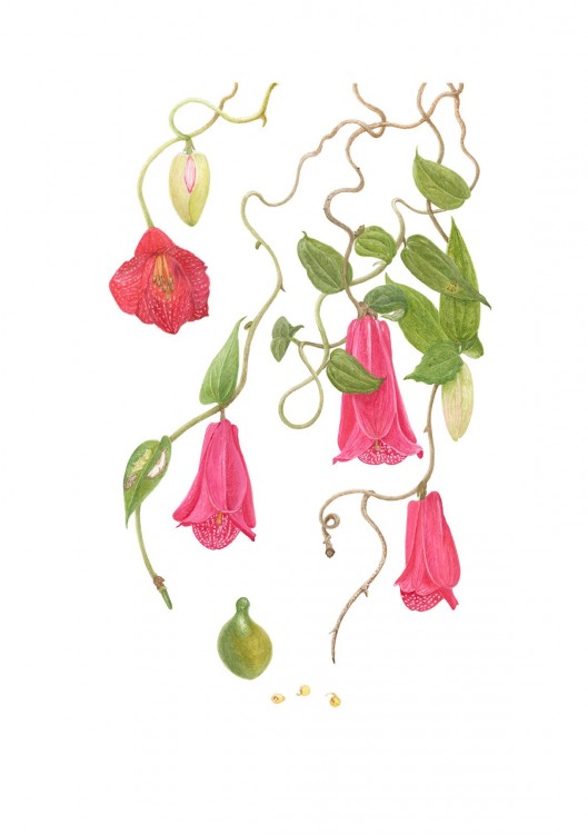 The painting of the Lapageria shows a small pod or fruit containing seeds that I found fallen on the ground under the vine. This was unusual given the absence of the hummingbird in NZ and confirmed by the garden curator who said seed pods were rarely seen. I wanted to paint this plant despite it being a very high climbing vine in the Botanical Gardens.