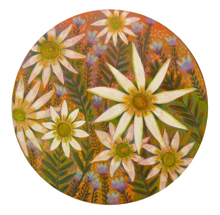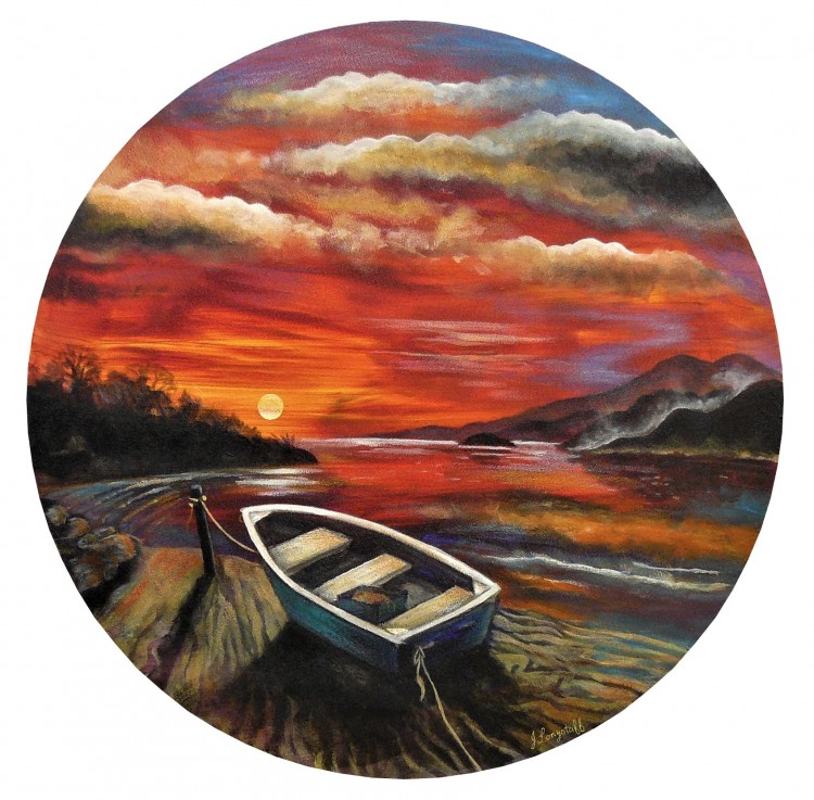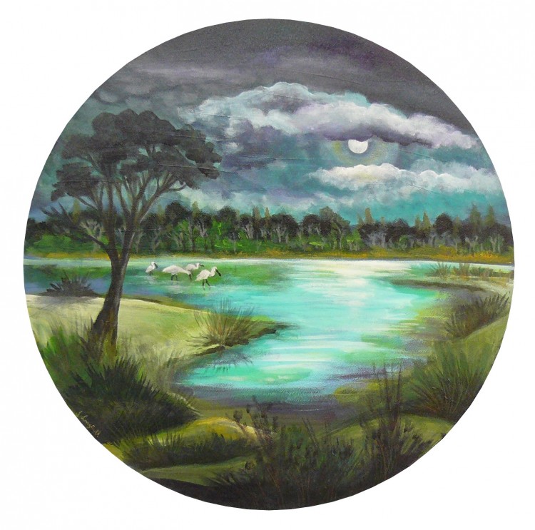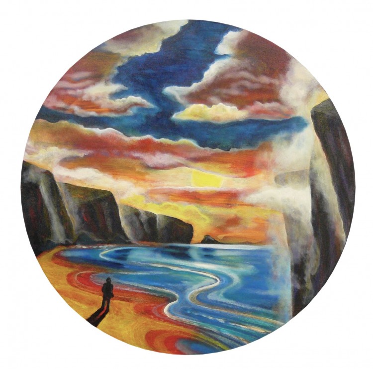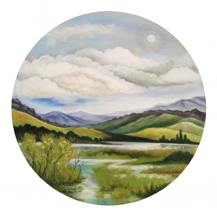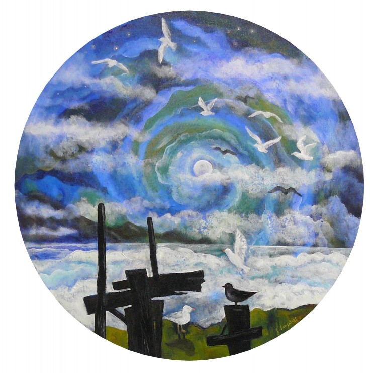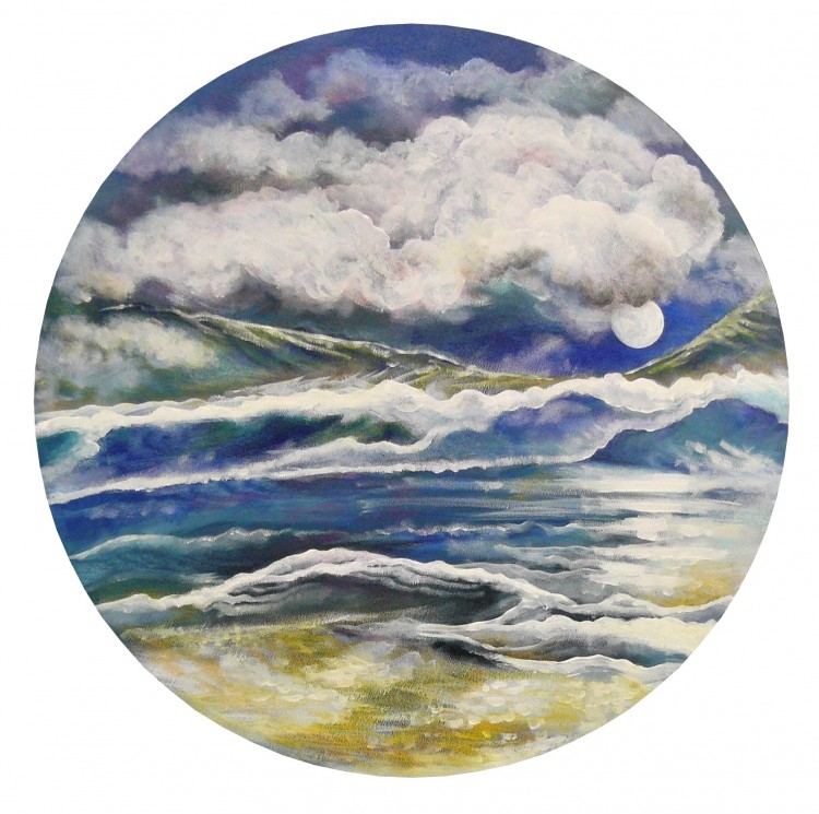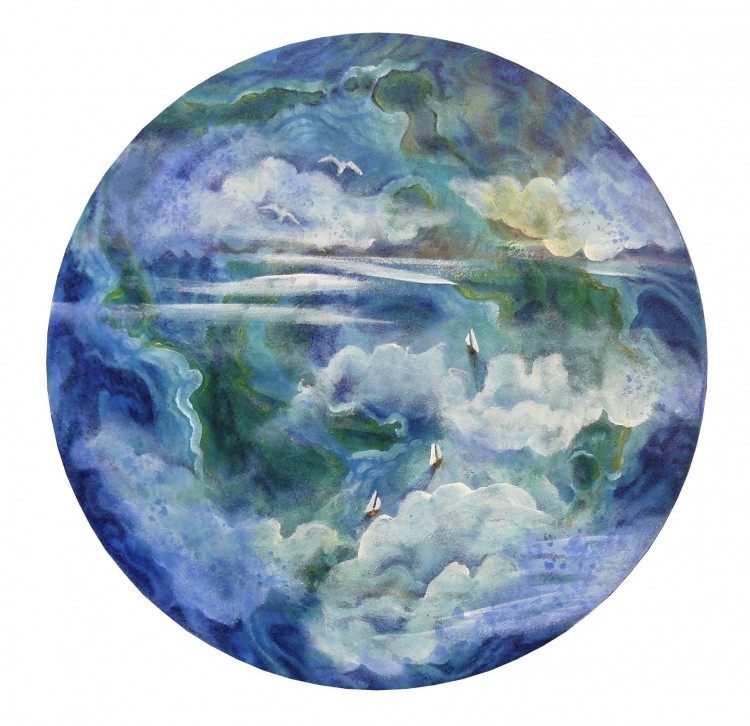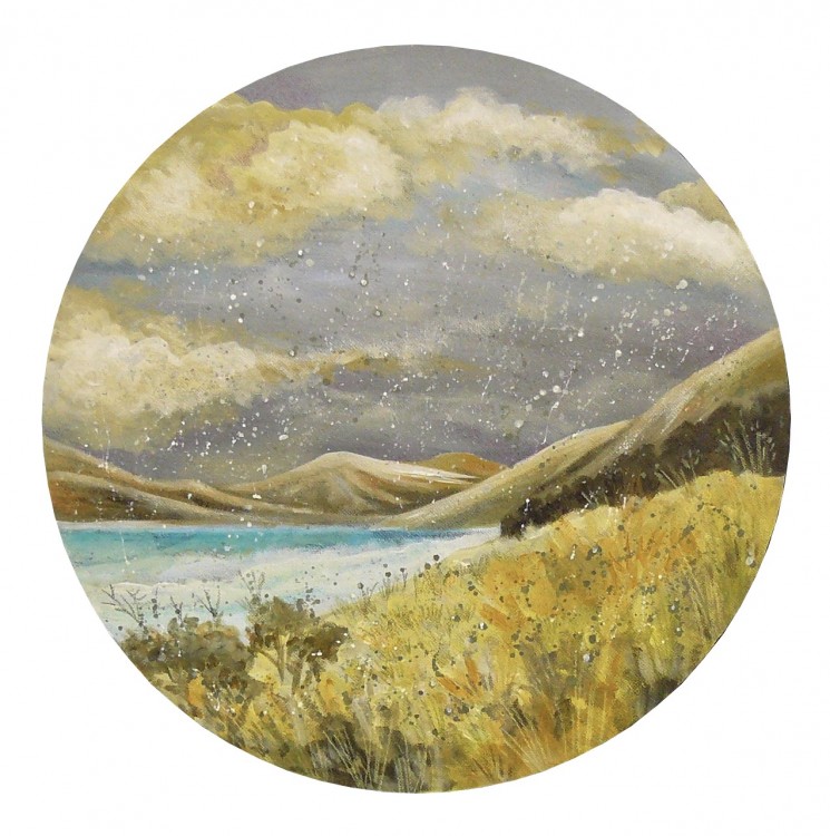 The circular rather than rectangular format has made me more aware of rhythms of energy in the compositions, and this has suited my subject matter of changing weather - particularly swirling clouds and mist - in land and seascapes.