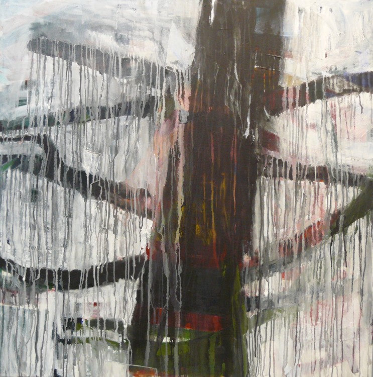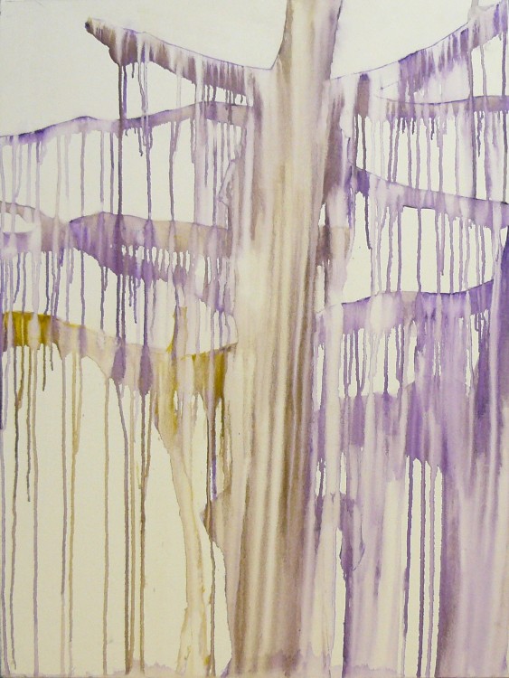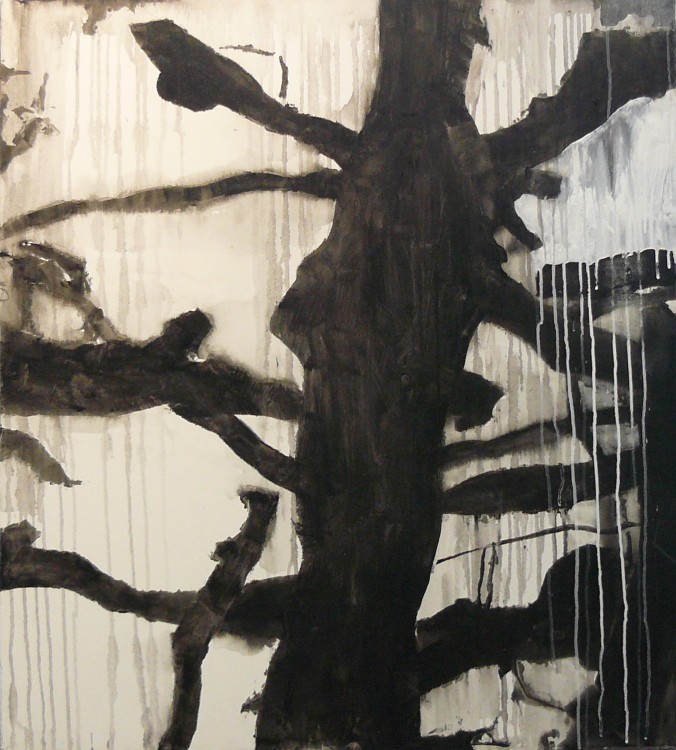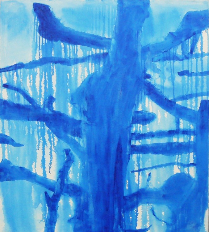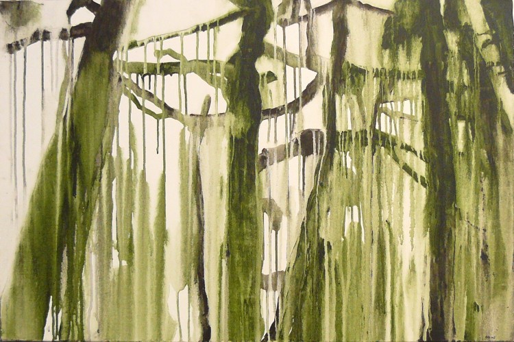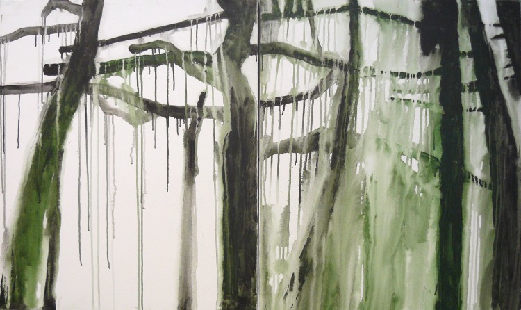 In my latest series of paintings, I have moved away from my earlier techniques to better respond to a Kahikatea rain forest. I admired the way fungal plants and moss hung off the branches so I deliberately adopted a dripping style in applying the watered-down acrylic paints similar to the way one might use Indian or Japanese inks. Apparently, Kahikatea can support entire ecosystems on their trunks and branches. A scientist once found 28 different plants living on one tree – lianas (twining and climbing plants like supplejack, kiekie and our native passionfruit and native jasmine. Water was also generously poured on. Various versions of the one scene were painted to try to refine and capture the essence of a typical rainforest with heavy downpours. At the same time, I rendered a few mountain scenes like Milford Sound and Lake Marian in Fiordland, because my partner and I enjoy exploring those areas. I have always admired Chinese and Japanese calligraphy and Painting. Recently, I saw some very fine modern examples of Chinese painting in the National Art Gallery in Singapore. The artist did large heroic works on paper and experimental techniques. On my part I prefer painting on canvas although I have done a few compositions using traditional inks and paper.