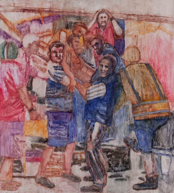 The initial inspiration for Rods and Poles began when one photograph of the destruction of Christchurch particularly took her attention. The photograph depicted rescue workers lowering a male victim down from a demolished building. It instantly brought to Jessica’s mind the Deposition of Christ – a theme in ancient religious painting portraying Christ being removed from the cross after he had died, only to rise again three days later. Before a resurrection comes a time of dying, and as the earth went through a time of shaking, new priorities began to present themselves, and old things were to be laid aside.