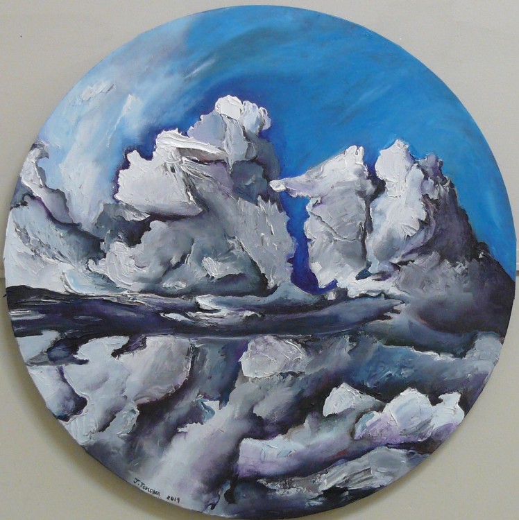 Clouds tower amass, in full glory; bravado, animated, stacked high in the air.