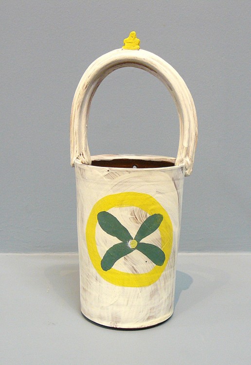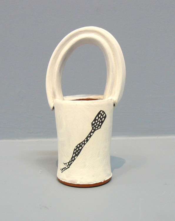 The different styles of object in the exhibition carry different ecosystem participants. Each of the plates serves up a species of phytoplankton. The vases are the water carriers in the system. The two bird sculptures are stickered with motifs indicating that all creatures share the waterways. Nature is feral and moves across the boundaries of all these containers and agents. -Marion Familton