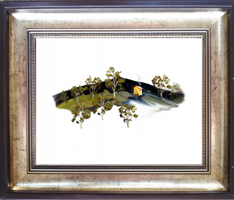 O’Kane has found picture frames which suggest times past. Presented here with his images, his works play with notions of the future.