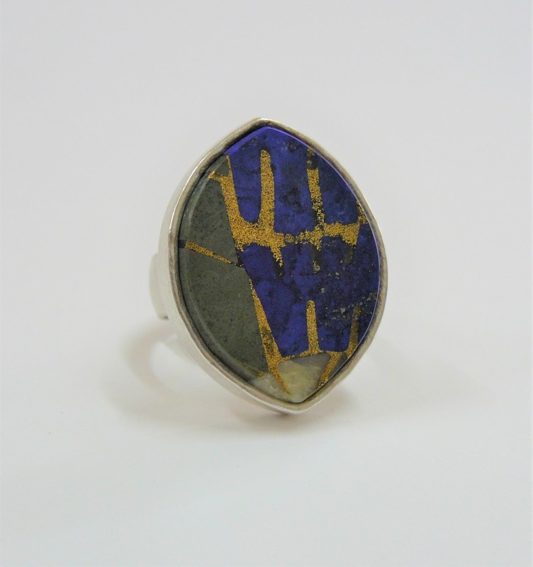 Silver, lapis and riverstone mosaic ring with 24ct gold dust.