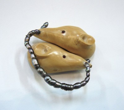 Boxwood, freshwater pearls, sterling silver and garnet brooch.