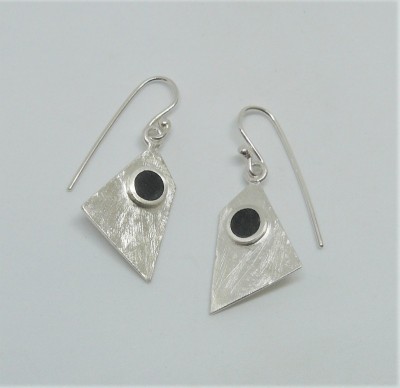 Round flat diamond earrings, sterling silver and black resin. J1050. 34mm (total length, including hook).
