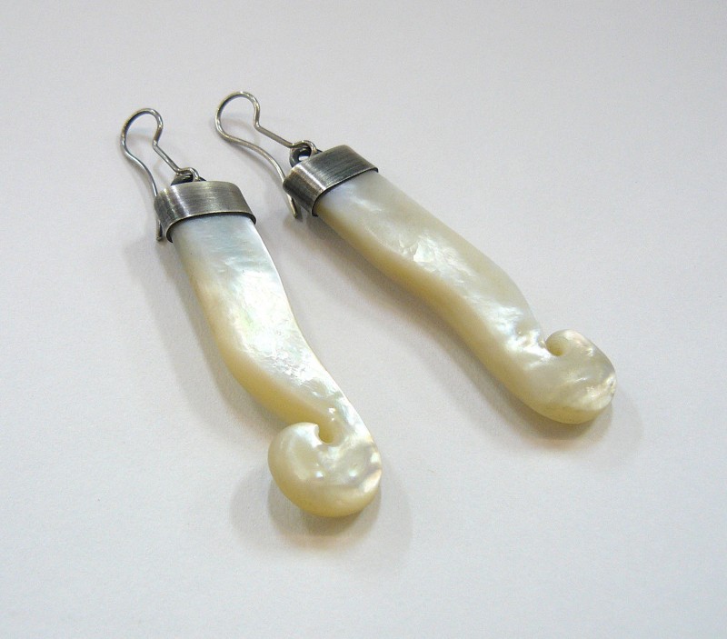 Poseidon Earrings. Fine silver, sterling silver and mother of pearl. 76mm long (including hook). J3007.
