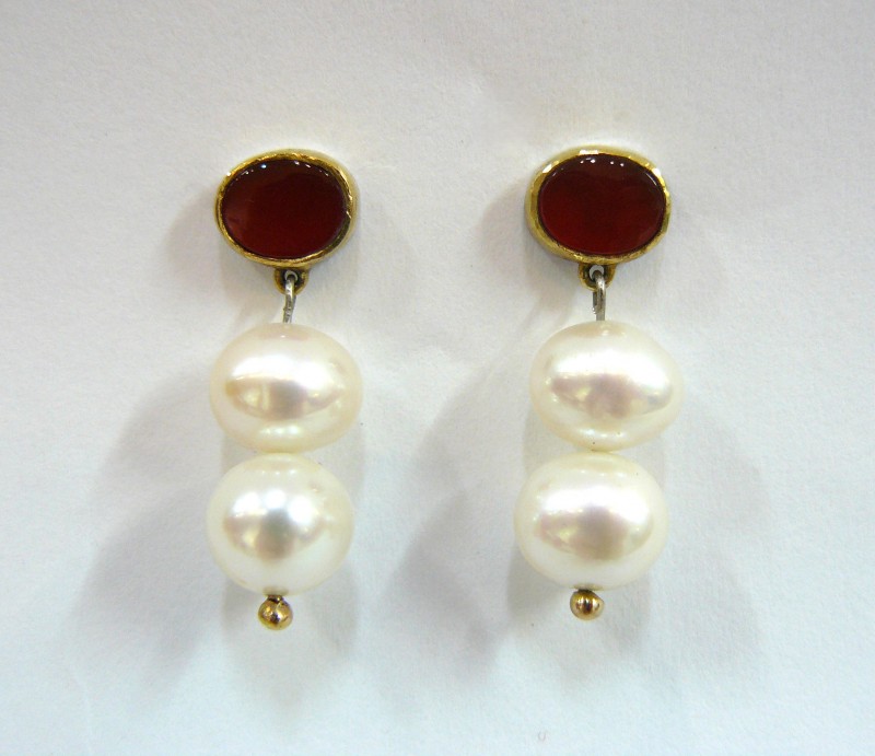 Carnelian and pearl earrings. Carnelian, 22ct gold, pearls and 18ct gold.