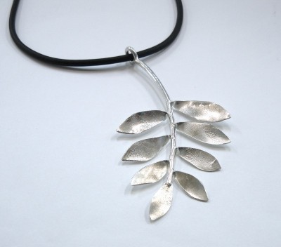 Sterling silver Leaf pendant on soft rubber cord.