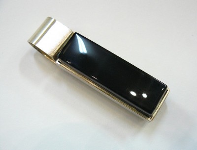 Maxi-chain Pendant - Janus B/W. Silver and glass (black on one side, silver on the other). 70mm long. J2986.